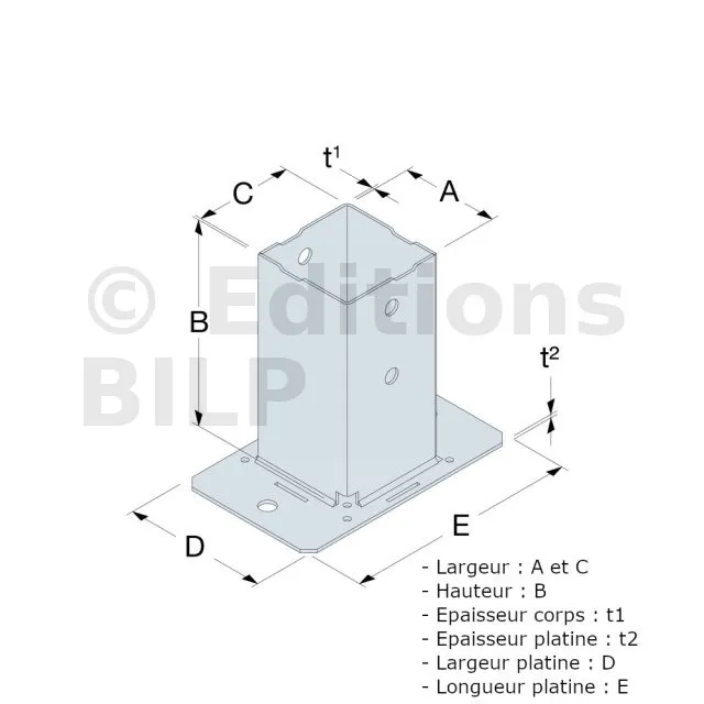 Pied de poteau pour muret et bord de dalle - Finition GALVANISEE - Réf. PPJBM70