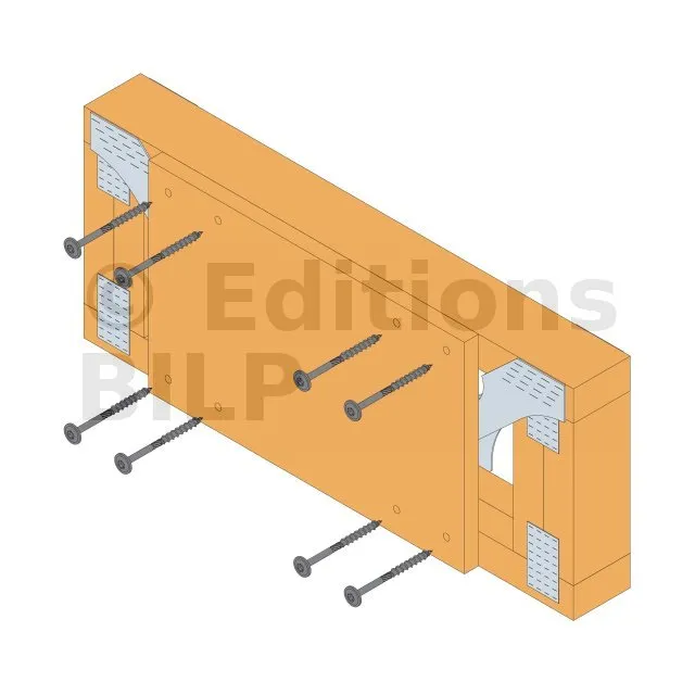 - L’installation optimisée nécessite de fixer un bloc de renfort en contreplaqué de 18 mm sur la face de la poutre métallique ajourée. Ce bloc doit avoir une largeur minimum de 400 mm et une hauteur correspondant à celle de la poutre métallique. Il est installé avec 8 vis ESCR8.0x80mm, positionnées conformément à l’illustration dans la section "Notes d’installation".