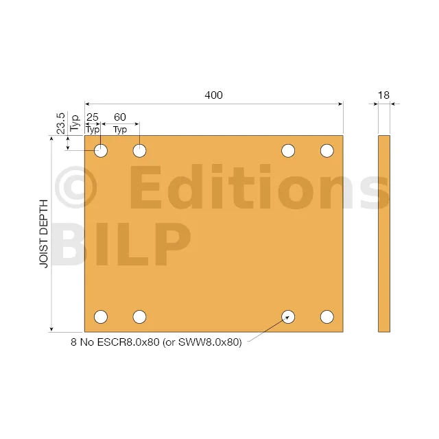 1. Cas d’une poutre porteuse métallique ajourée : installer une plaque en contreplaqué de 18 mm sur la face de la solive à âme métallique. Cette plaque doit avoir une longueur minimum de 400 mm et couvrir toute la hauteur de la solive à âme métallique. La plaque en contreplaqué est installé avec 8 vis ESCR8,0x80mm, positionnées conformément à l’illustration ci-dessous,