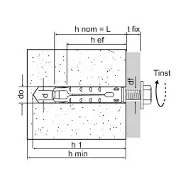 | Références | Référence | Dimensions [ØxL] [mm] | Dimensions de la vis hexagonale [ØxL] [mm] | Ep. max [tfix] pce à fixer [mm] | Ø perçage [d0] | Profondeur mini perçage [h1] | Profondeur d’ancrage nominale [hnom] | Profondeur d’ancrage mini [hef] | Ø perçage pce à fixer [df] | Ep. mini [hmin] support | Longueur filetage [Lv] | Couple de pose [Tinst] |