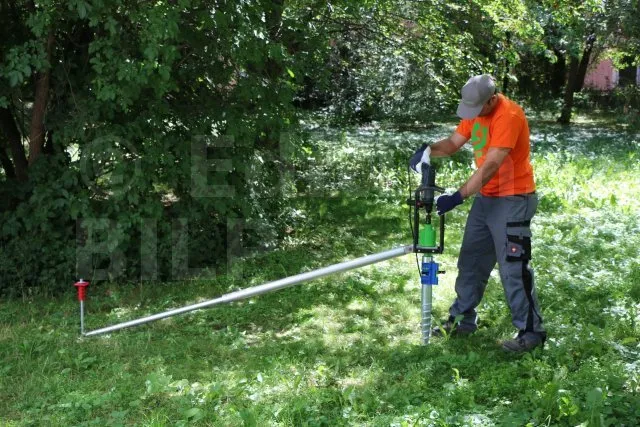 7- Sécurisez la barre télescopique contre la rotation. La direction du mouvement est vers la gauche. Appuyez-la contre un arbre, une voiture, un bâtiment, une vis de sol forée ou un autre support solide !