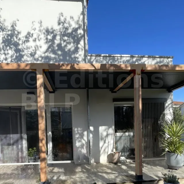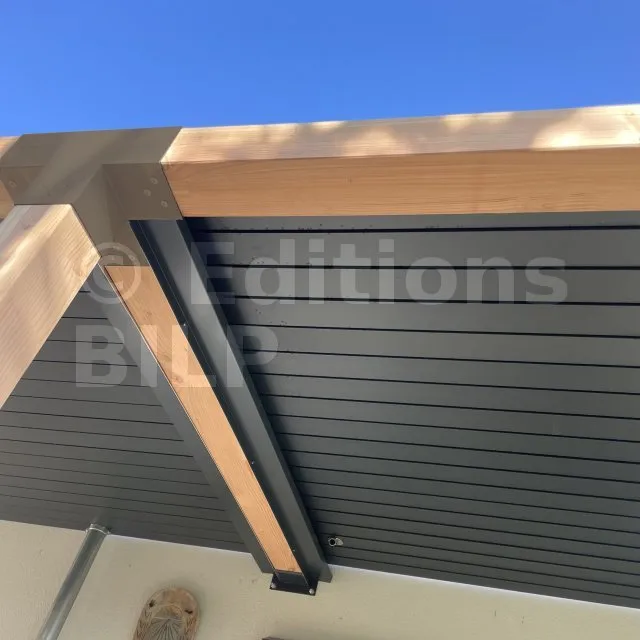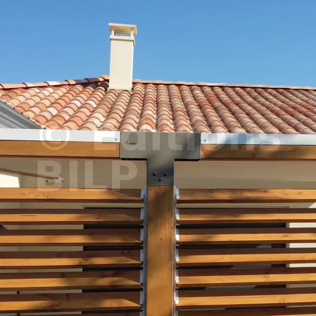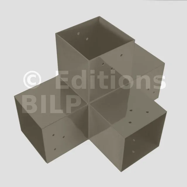Il permet de raccorder une poutre de 90x90mm perpendiculairement à un chevron de 90x90mm, le tout étant supporté par un poteau vertical de 90x90mm.