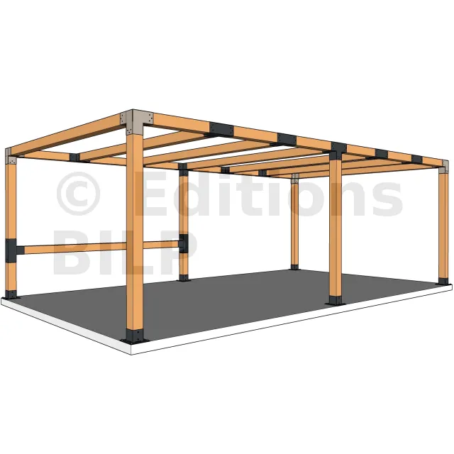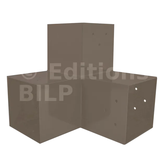 Il est utilisé dans un angle extérieur. Ce connecteur va permettre de raccorder une grosse poutre 120x120mm perpendiculairement à une poutre 120x120mm, le tout étant supporté par un poteau vertical 120x120mm.