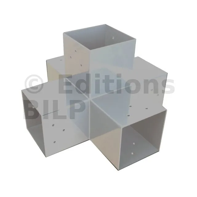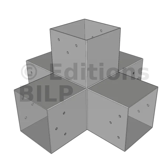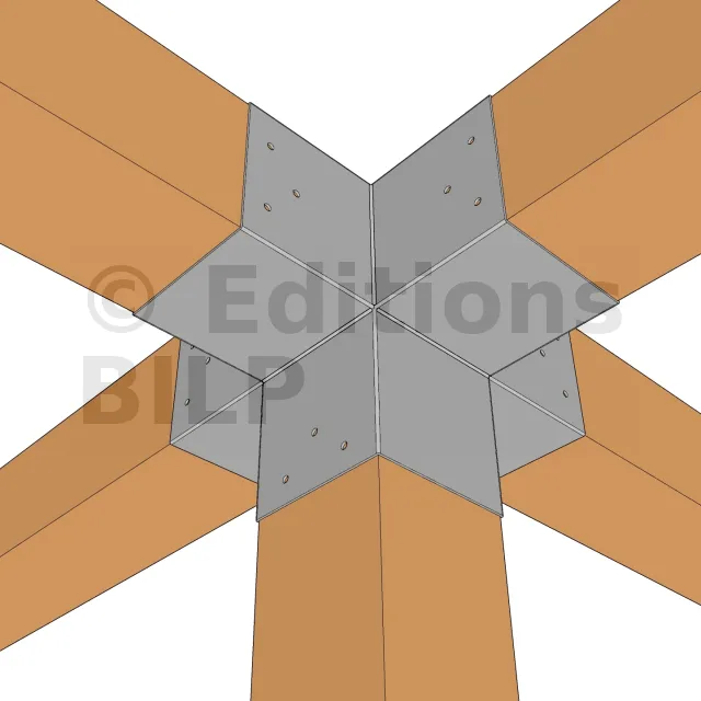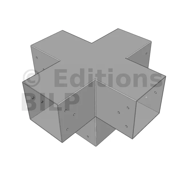Il permet de raccorder deux poutres 120x120mm perpendiculairement à une autre poutre 120x120mm, le tout étant supporté par un poteau vertical de 120x120mm.