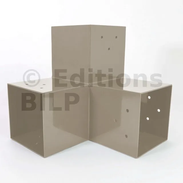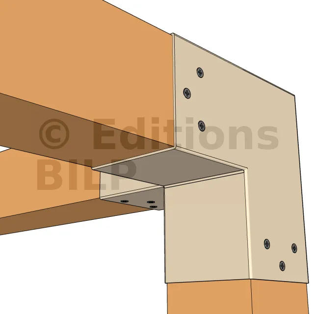 Il est utilisé dans un angle extérieur. Ce connecteur va permettre de raccorder une poutre 90x90mm perpendiculairement à une poutre 90x90mm, le tout étant supporté par un poteau vertical 90x90mm.