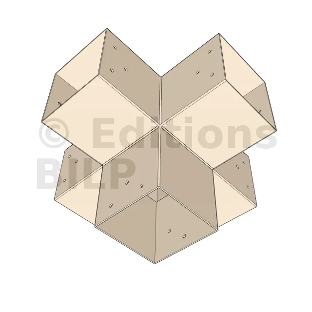 Il permet de raccorder deux poutres 120x120mm perpendiculairement à une autre poutre 120x120mm, le tout étant supporté par un poteau vertical de 120x120mm.