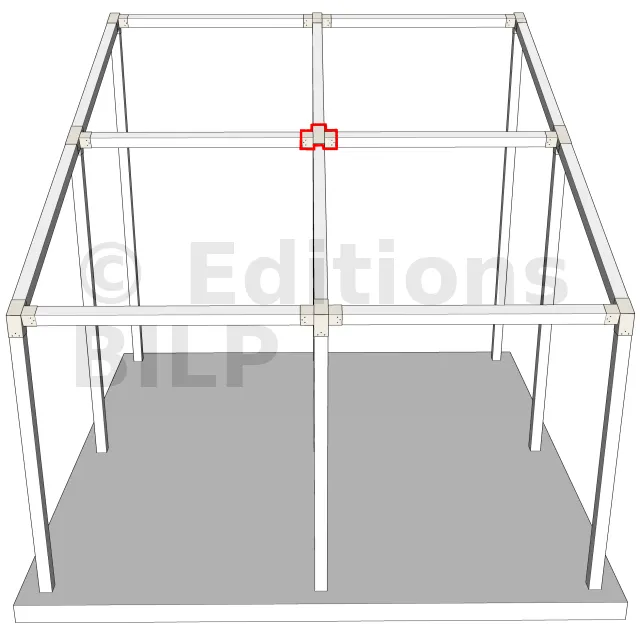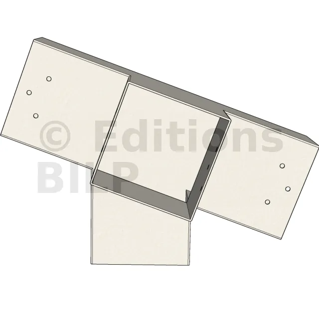 Connecteur métallique permettant l’assemblage précis de deux chevrons inclinés à 20°, de deux poutres horizontales et d’un poteau vertical central, tous de section 120x120 mm. Il garantit une liaison rigide et symétrique en un point central, assurant la stabilité de l’ensemble de la structure.