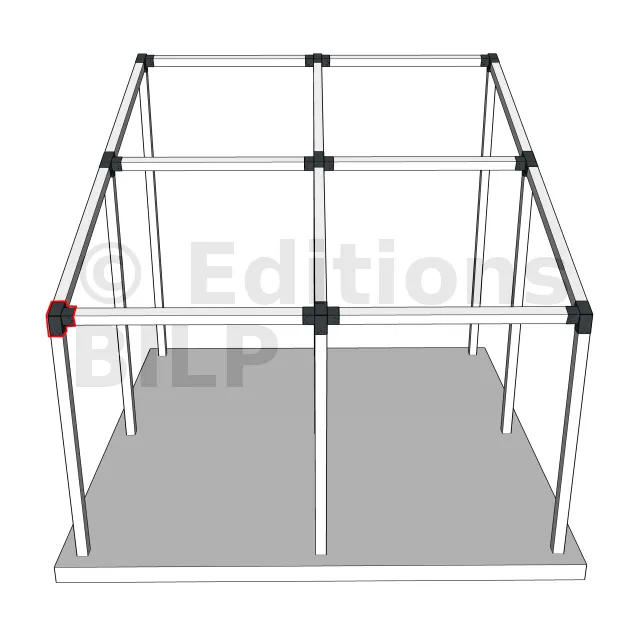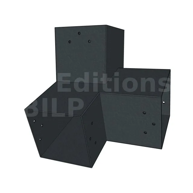 Il est utilisé dans un angle extérieur. Ce connecteur va permettre de raccorder une poutre 120x120mm à une poutre 120x120mm avec une pente de 20°, le tout étant supporté par un poteau vertical 120x120mm.