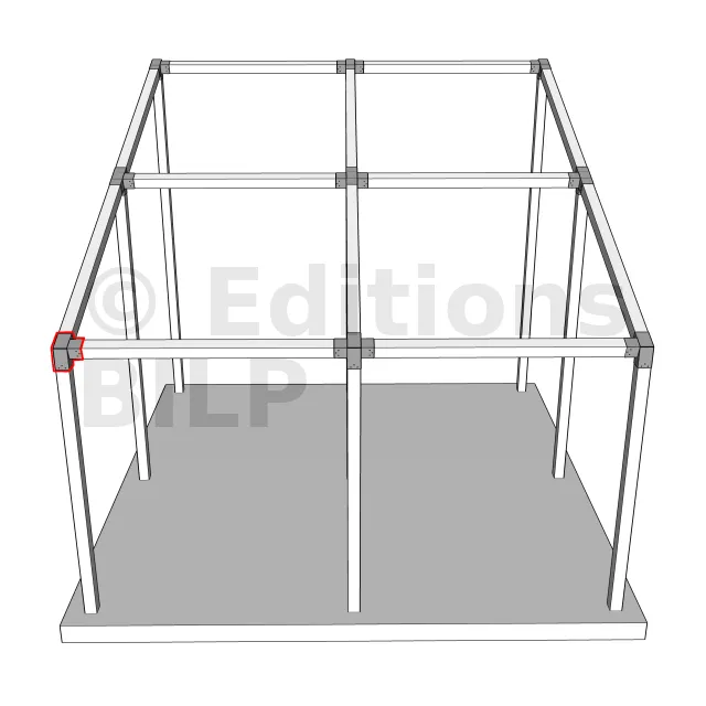 Il est utilisé dans un angle extérieur. Ce connecteur va permettre de raccorder une poutre 120x120mm à une poutre 120x120mm avec une pente de 20°, le tout étant supporté par un poteau vertical 120x120mm.