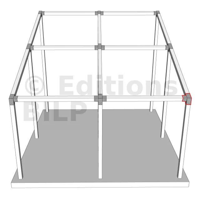 Il est utilisé dans un angle extérieur. Ce connecteur va permettre de raccorder une poutre 120x120mm à une poutre 120x120mm avec une pente de 20°, le tout étant supporté par un poteau vertical 120x120mm.
