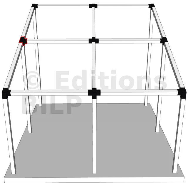 Connecteur d’angle intérieur à quatre directions, conçu pour l’assemblage de deux poutres en section 120x120 mm formant un angle de 20° avec un poteau vertical de même section. Il assure une liaison structurelle rigide et orthogonale à mi-hauteur, garantissant la stabilité de l’ensemble.