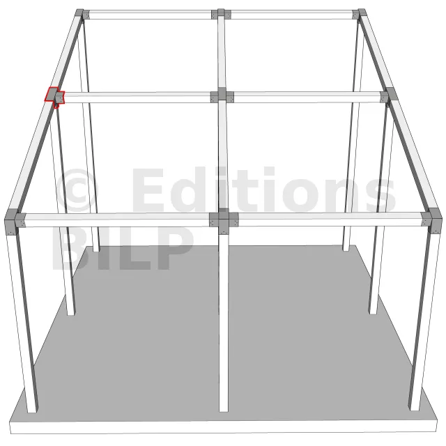 Connecteur d’angle intérieur à quatre directions, conçu pour l’assemblage de deux poutres en section 120x120 mm formant un angle de 20° avec un poteau vertical de même section. Il assure une liaison structurelle rigide et orthogonale à mi-hauteur, garantissant la stabilité de l’ensemble.