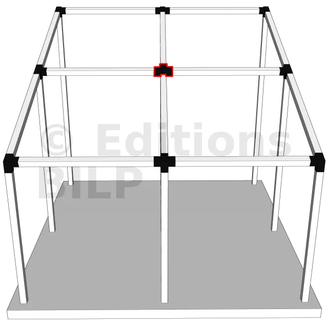Connecteur métallique permettant l’assemblage précis de deux chevrons inclinés à 20°, de deux poutres horizontales et d’un poteau vertical central, tous de section 120x120 mm. Il garantit une liaison rigide et symétrique en un point central, assurant la stabilité de l’ensemble de la structure.