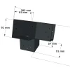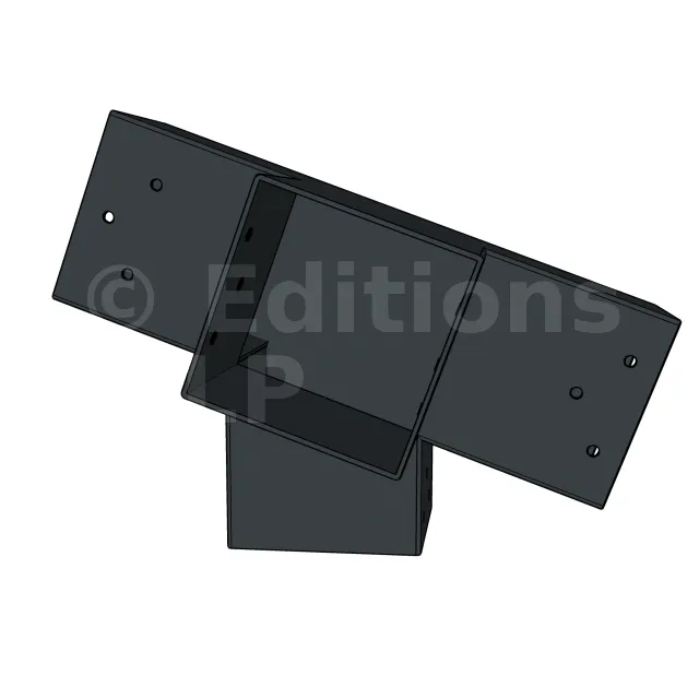 Connecteur d’angle intérieur à quatre directions, conçu pour l’assemblage de deux poutres en section 90x90 mm formant un angle de 20° avec un poteau vertical de même section. Il assure une liaison structurelle rigide et orthogonale à mi-hauteur, garantissant la stabilité de l’ensemble.