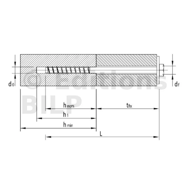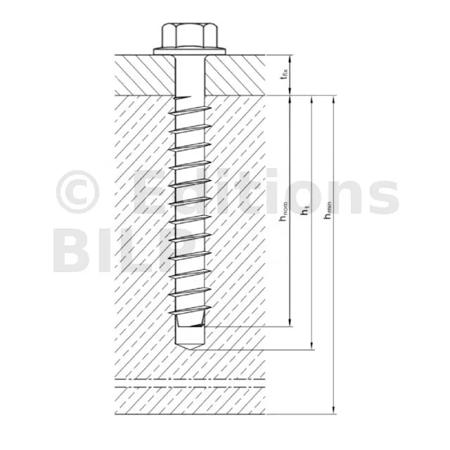 - Vis à insérer sans cheville dans un trou pré-percé. Le diamètre du foret pour le pré-perçage est indiqué dans la caractéristique "Diamètre nominal du foret, d0".