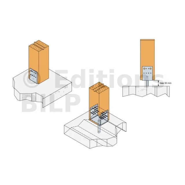 La distance entre la platine et le béton doit être de 50 mm maxi.