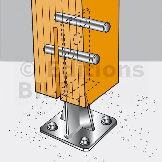 - Connexion bois sur support rigideSur poteau : 2 broches Inox Ø12 ou Ø16 ou Boulons inox Ø 12 mm ou 16 mm suivant perçages ; sur béton : 4Ø12 (goujons BOAX-II M12-104/5 A4 ; tige filetée M12) ; sur acier : Boulons inox Ø12