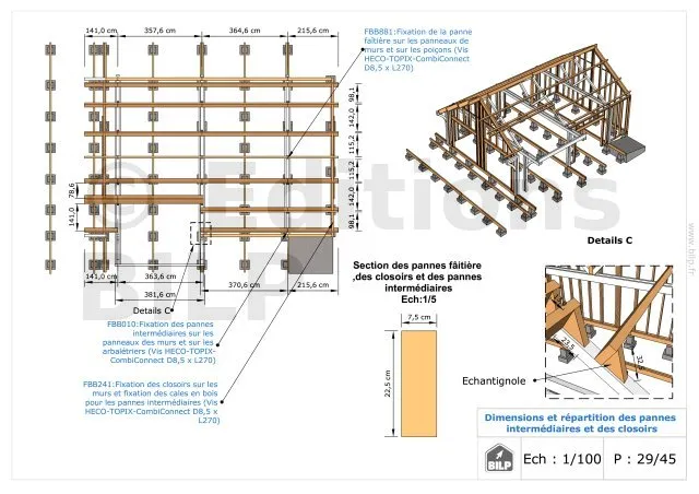 Les plans de structure à l’échelle sont faciles à lire et à comprendre. Ils vous permettrons de réaliser vous-même la structure de votre cabane. Les détails de réalisation sont indiqués. Nous calculons et optimisons les dimensions et les sections de pièces de bois.