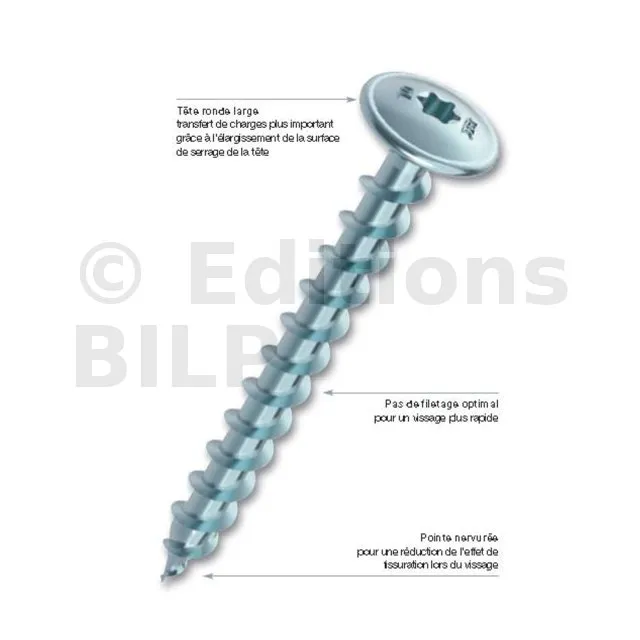 - Tête ronde large avec une sur-épaisseur sous la tête ; meilleur centrage de la connection bois et fixation sans endommagement du support en métal