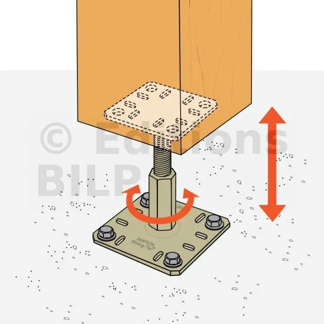 Fixez la platine inférieure sur le support à l’aide de goujons d’ancrage ou tirefonds adaptés au matériau (béton, dalle ou bois porteur).