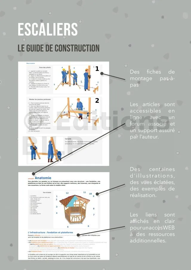 Des informations concrètes pour votre projet. Tous les secrets, tous les trucs et astuces pour réussir la construction de votre escalier. Toutes les techniques ainsi que tous les modèles vous sont décrits de façon objective et indépendante. Des vues détaillées pour vous décrire toutes les étapes de la construction.