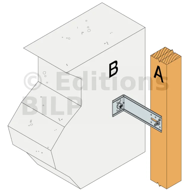 - Connexion bois sur support rigideAile A : 1LAG Ø8,0x50 et 2CSA Ø5,0x40 ; Aile B : 1Ø8 (goujon WA, Cheville à frapper HIPC ou tige filetée LMAS)