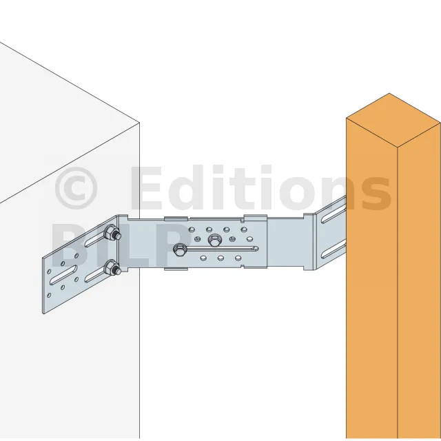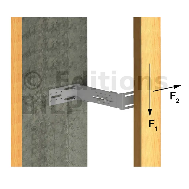L’équerre AB45C permet de fixer le chevron d’angle, dans le cas d’un angle sortant. Ce chevron d’angle appartient à l’ossature secondaire de la structure. Cette ossature sert de support aux revêtements extérieurs de type bardage.
