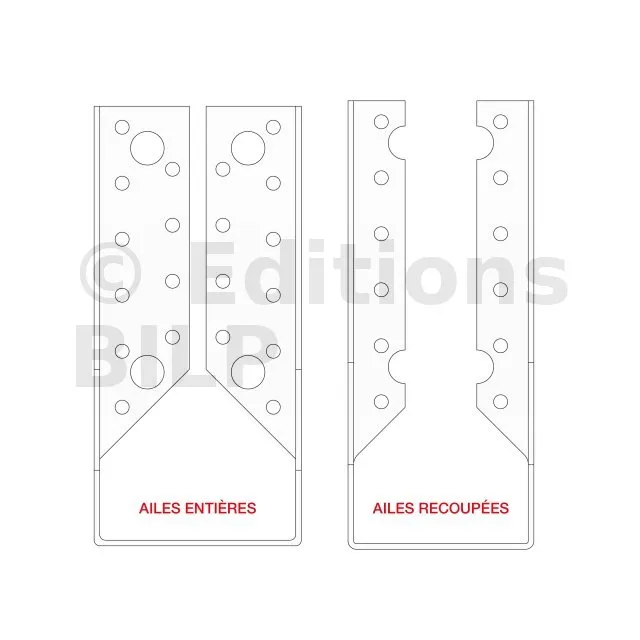 | Références | Développé [mm] | Avec perçages de pointes uniquement (ailes recoupées) | Avec perçages de tirefonds et pointes (ailes entières) |