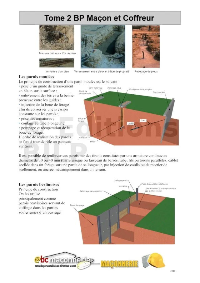 Vous aurez avec cet ouvrages, des connaissances complètes en technologie et en pratique du métier de maçon, coffreur qui vous permettront : de gravir les échelons afin de poursuivre votre carrière vers les postes d’encadrement de chantier, ou pour les auto constructeurs de réaliser vous-même certains travaux que vous n’auriez jamais imaginé et surtout pour les personnes faisant construire, vous aurez le savoir nécessaire afin de surveiller les travaux du gros œuvre afin d’éviter toutes les malfaçons qui peuvent perturber votre esprit.