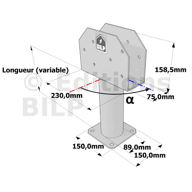 Poteau structurel OSP - D89mm - Platine haute en U 75x230x158,5mm - Embase 150x150mm - Réf. SP1-SP6Ø89_75x230