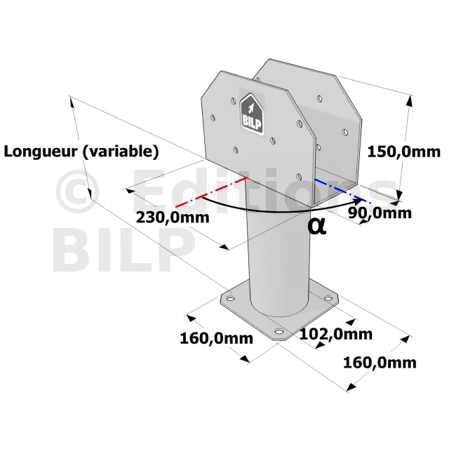 Poteau structurel OSP - D102mm - Platine haute en U 90x230x150mm - Embase 160x160mm - Réf. SP1-SP6Ø102_90x230