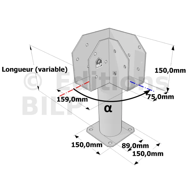 Poteau structurel OSP - D89mm - Platine haute en L 75x159x150mm - Embase 150x150mm - Réf. SP1-SP7Ø89_75x159