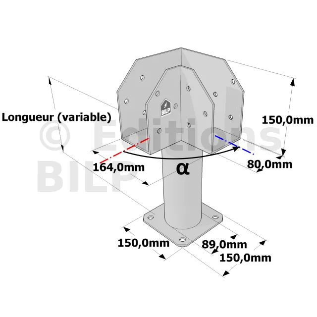 Poteau structurel OSP - D89mm - Platine haute en L 80x164x150mm - Embase 150x150mm - Réf. SP1-SP7Ø89_80x164