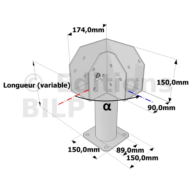 Poteau structurel OSP - D89mm - Platine haute en L 90x174x150mm - Embase 150x150mm - Réf. SP1-SP7Ø89_90x174