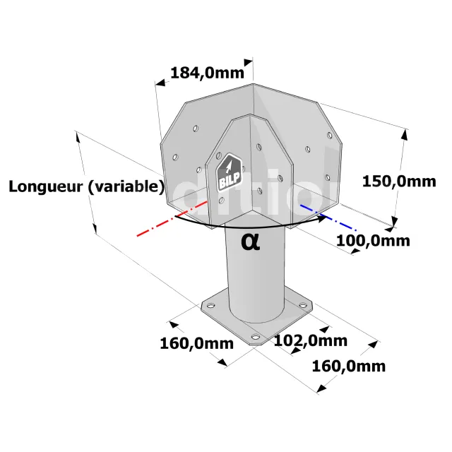 Poteau structurel OSP - D102mm - Platine haute en L 100x184x150mm - Embase en angle 160x160mm - Réf. SP1-SP7Ø102_100x184
