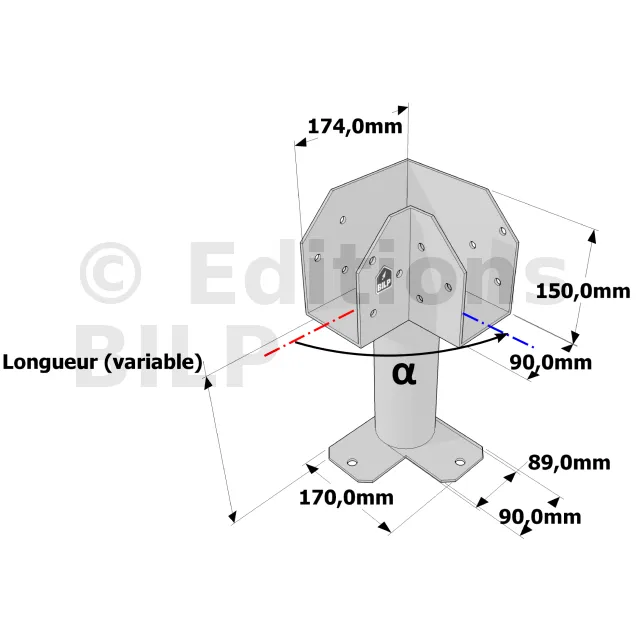 Poteau structurel OSP - D89mm - Platine haute en L 90x174x150mm - Embase en angle 90x170mm - Réf. SP4-SP7Ø89_90x174