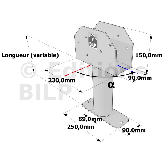 Poteau structurel OSP - D89mm - Platine haute en U 90x230x150mm - Embase rectangulaire 90x250mm - Réf. SP5-SP6Ø89_90x230