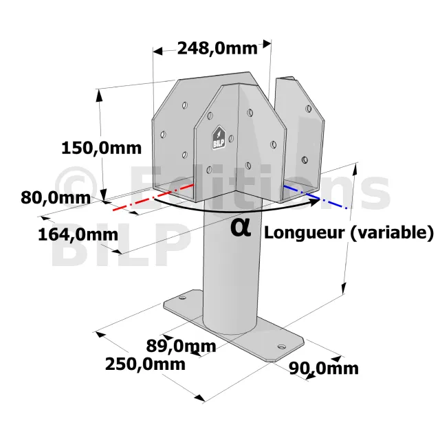 Poteau structurel OSP - D89mm - Platine haute en T 80x164x150mm - Embase rectangulaire 90x250mm - Réf. SP5-SP8Ø89_80x164