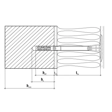 Longueur minimale de la cheville Ld = tfix + ttol + heff avec tfix : épaisseur maximale des pièces à fixer, ttol : épaisseur des sous-couches (adhésif + enduit existant), heff : profondeur d’ancrage.